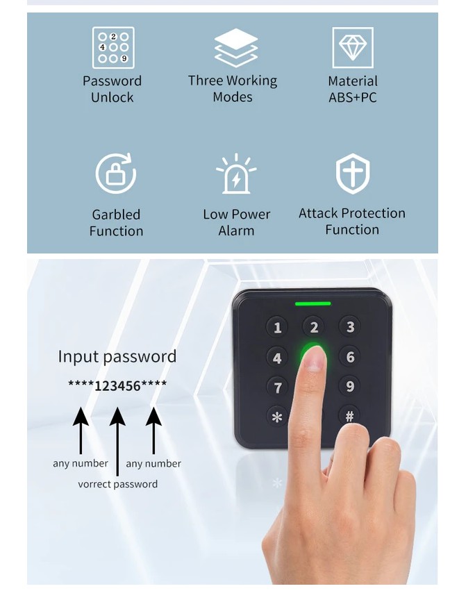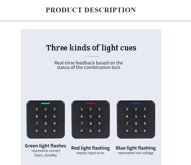 3、Attack protection: If the password is entered incorrectly 3 times, the electronic lock will be locked for 3 minutes.